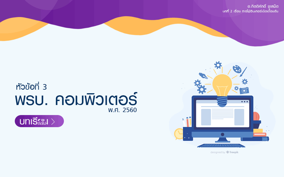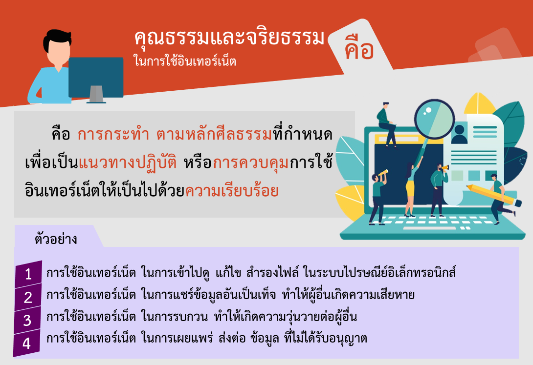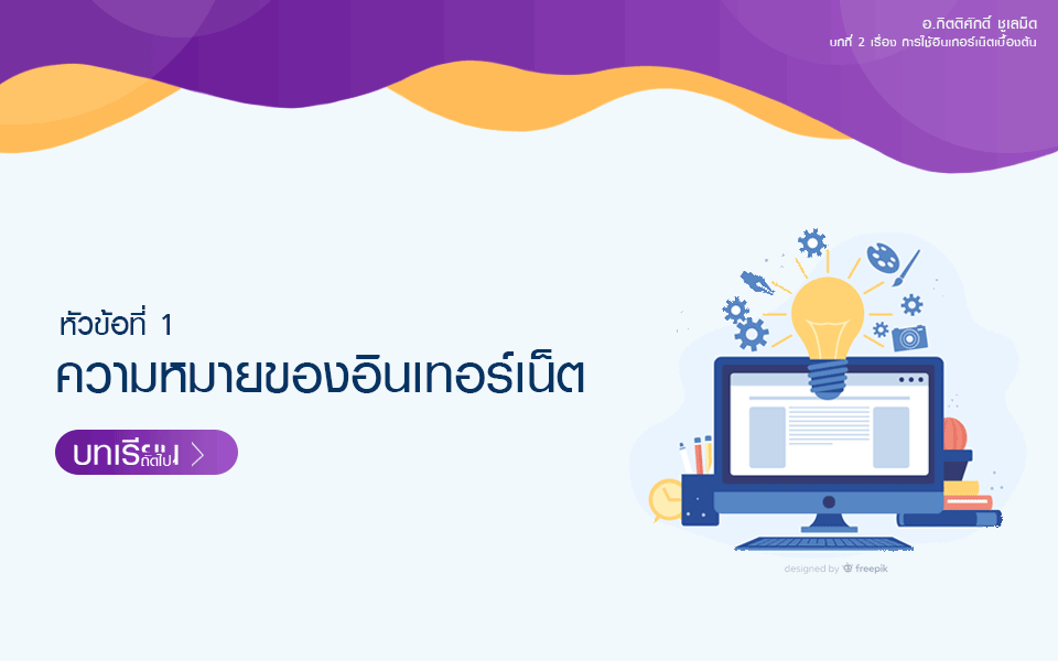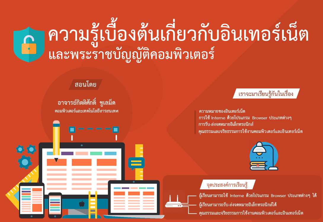 สื่อการเรียนรู้ เรื่องอินเทอร์เน็ตเบื้องต้น ประกอบไปด้วย 2 หัวข้อ คือ   หัวข้อที่ 1. เรื่อง ความหมายของอินเทอร์เน็ต (คลิก)   หัวข้อที่ 2. เรื่อง คุณธรรมและจริยธรรมการใช้งานคอมพิวเตอร์และอินเทอร์เน็ต (คลิก) ผู้เรียนสามารถเรียนรู้ได้จากวิดีโอ ภาพ เสียง ตามลำดับขั้นตอนของเนื้อหาและกระบวนการเรียนรู้ ดังนี้